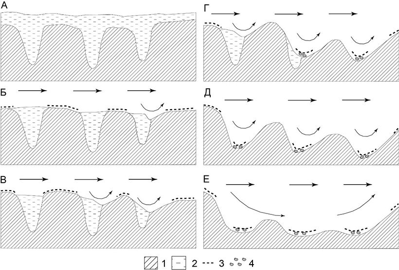 Рис. 9. Возможный механизм формирования эрозионных котловин на протяжении голоцена (схема, не в масштабе). А – погребенный рельеф древних покмарок, Б, В – начало формирования эрозионных котловин и палимпсестовых отложений, Г – котловины расширяются и углубляются, на их «подветренных» склонах сохраняются реликты воронок, в днищах накапливается грубый материал, Д – уничтожение древних воронок эрозией, Е – котловины сливаются, образуя ров с реликтом перемычки. Стрелками показаны направления перемещения придонных вод. 1 – морские и ледниково-морские отложения позднего плейстоцена (осташковского?) возраста, 2 – песчано-илистые морские отложения позднего плейстоцена-голоцена, 3 – палимпсестовые отложения, 4 – валуны.