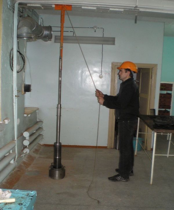 В качестве примера можно рассмотреть процесс тарировки наконечника зонда динамического зондирования. В школьном учебнике физики имеется задача. Иллюстрация к ней показана на рисунке 2. На пружину сбрасывается металлический шарик. Если известны масса шарика, высота, с которой он падает, и жёсткость пружины, то можно определить максимальную величину силы удара и осадку пружины. По образу и подобию этой задачи мы устроили специальный стенд (рис. 3). Только мы сбрасываем не шарик, а наконечник зонда с отрезком штанги. Масса груза нам известна, высота падения и жёсткость пружины тоже. В нашем эксперименте нас интересует максимальная сила соударения наконечника зонда и пружины. Электронные датчики, которые находятся в наконечнике зонда, фиксируют силу удара в виде электронного сигнала в миллиамперах. Далее мы, решая арифметическую задачу, определяем максимальную силу соударения наконечника зонда и пружины. И это значение силы удара наконечника зонда делим на максимальную величину сигнала в миллиамперах и получаем практический коэффициент К, используя который в реальном эксперименте, определяется сила удара наконечника зонда путём умножения коэффициента К на показание электронного датчика в миллиамперах.