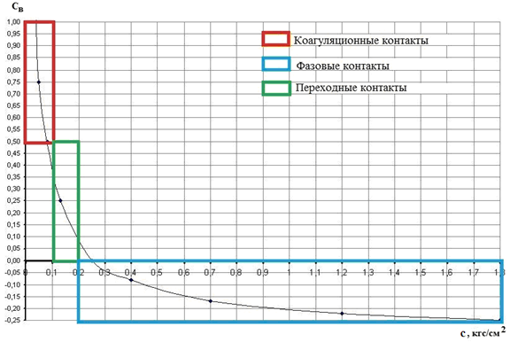 Итак, зная две «критические точки состояния грунтов» (We > WL и We < Wρ), можно построить графики зависимости «удельное сцепление – показатель консистенции грунта естественного сложения» (рис. 1) и получить распределение типов контактов в зависимости от прочности для каждой разновидности глинистого грунта. Подчеркнем, что номограмма, представленная на рисунке 1, построена исходя из ныне существующей градации типов контактов в грунте. Очевидно, что в природных грунтах переходные контакты (в той или иной мере) будут присутствовать при 1,0> CВ> -0,25.