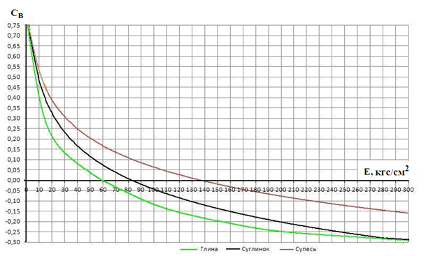 Таким образом, с большой долей достоверности мы можем определить только начало деформации грунта природной консистенции в естественном сложении. Например, для мягкопластичных суглинков модуль деформации Е = 10 кгс/см2 при СВ = 0,5. Исходя из типа микростроения («ближних коагуляционных» контактов по Соколову [21] и «переходных» по сути) меньше он быть априори не может. При приложении же бульшей вертикальной нагрузки (после наступления стабилизации после предыдущей нагрузки) может. Только это будет уже совсем другой показатель, не имеющий отношения к природным характеристикам грунта.