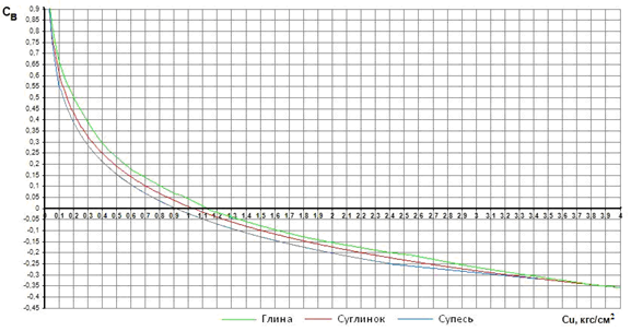 Рис. 3. Зависимости «показатель консистенции грунта естественного сложения СВ — недренированная прочность cu» для трех разновидностей минеральных глинистых грунтов