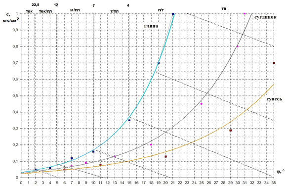 На рисунке 2 представлены зависимости «показатель консистенции грунта естественного сложения – удельное сцепление» применительно к конкретным грунтам. Из рисунка видно, что переход через вторую критическую точку грунта (We < Wρ) у разных разновидностей глинистых грунтов различен: у супеси удельное сцепление в этой точке составляет 0,20 кгс/см2, у суглинков – 0,25 кгс/см2. По результатам лабораторных определений построены только графики для суглинков и супесей. В силу того, что классические глины на территории Санкт-Петербурга практически отсутствуют, график для глин, показанный на рисунке 2, носит теоретический характер и должен будет быть подтвержден экспериментальными исследованиями. Пока, по всей видимости, стоит ожидать, что сцепление глин будет лежать в диапазоне 0,25-0,30 кгс/см2. Вполне вероятно, что данные значения соответствуют минимальной начальной прочности фазовых контактов в грунте.