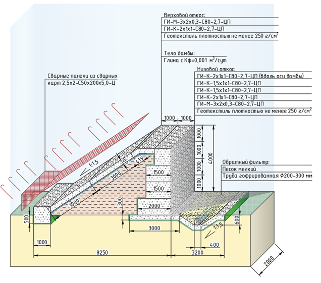 Участок располагался в непосредственной близости от русла, что ограничивало габариты будущего сооружения: подошва дамбы должна была вписаться в полосу шириной 8–10 м, при том, что отметка верхнего бьефа поднималась на 4 м выше дневной поверхности. Типовая земляная плотина в таких условиях не проходила по ширине, поэтому было принято решение сократить поперечное сечение, применив комбинированную схему: нижний откос запроектировали практически отвесным, сформировав его подпорной стеной из габионов, а верховой откос с уклоном 1:1,5 укрепили экраном из негрунтовых материалов. Итоговая конструкция отражена на рисунке 3.