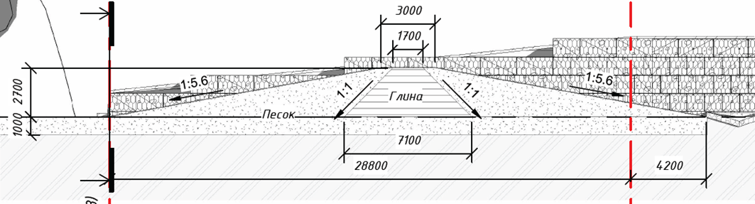 Рис. 6. Поперечное сечение дамбы на подъезде к насосной станции