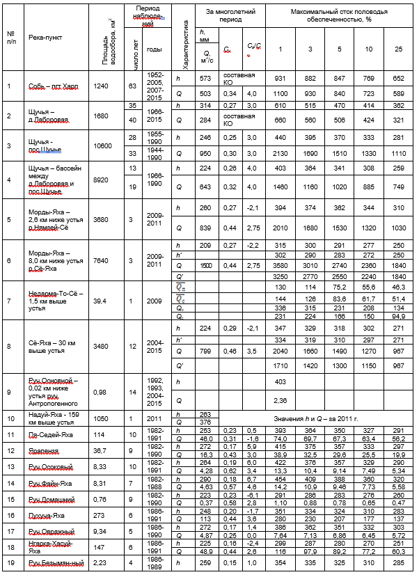 Таблица 2. Максимальный сток весенне-летнего половодья рек и малых водотоков полуострова Ямал и прилегающей южной тундры