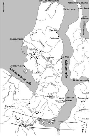 Рис. 1. Схема расположения гидрологических стационаров и постов экспедиций ФГБУ «ГГИ», действующих метеорологических станций Росгидромета. Обозначения: 1 — граница тундры; 2 — северная граница лесотундры; 3 — гидрологический стационар; 4 — гидрологический пост; 5 — метеорологическая станция. Цифры рядом с условными знаками 3-4 – номера гидрологических постов по табл. 1 и 2