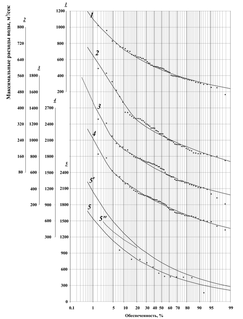 Неоднородность рядов дает основание, как и иные обстоятельства, дополнять статистический анализ характеристик стока рек другими приемами обработки данных. В связи с этим аналитическая кривая обеспеченности максимальных расходов воды на ГП р.Собь — пгт Харп незначительно сглажена графически в зоне обеспеченностей р≤5%, чтобы полнее учесть две верхних, заметно отклоняющихся от остальных, точки. Сглаживание тем более обосновано, что число точек экстремальных значений Q в зоне малых обеспеченностей будет, вероятно, ускоренно возрастать в современных меняющихся климатических условиях, а сглаженная кривая будет удовлетворительно им соответствовать.