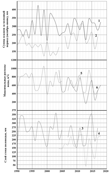 Рис.6 Многолетние колебания сумм предвесенних осадков холодного периода года и июня на метеостанциях Салехард (1) и Марре-Сале (2), слоя стока половодья в равнинной части бассейна р. Щучьей (3) и в бассейне р. Се-Яха – 30 км выше устья (4), максимальных расходов воды в равнинной части бассейна р. Щучьей (5) и в бассейне р. Се-Яха – 30 км выше устья (6)