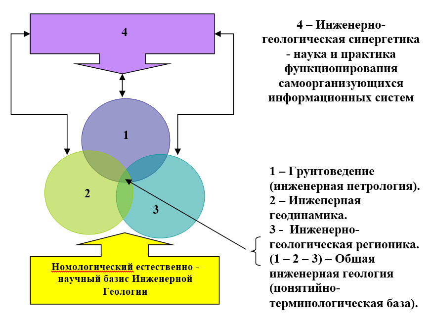 В приведённой структуре, помимо основных естественно-научных разделов и их стыковых областей, необходимо обратить внимание на инженерно-геологическую синергетику, в рамках которой должны формироваться общие правила построения и оптимизации процесса инженерных изысканий с точки зрения требований со стороны различных видов строительства, применения соответствующей техники, приборов и методик, правил взаимодействия с другими участниками строительного процесса, соблюдения критериев надёжности, точности и своевременности инженерно-геологической информации.
