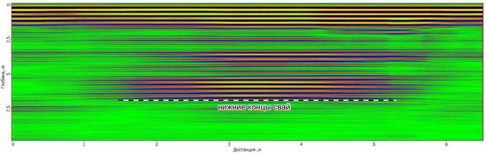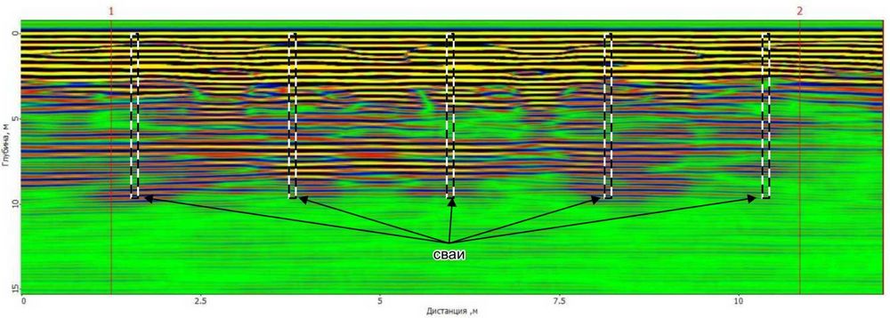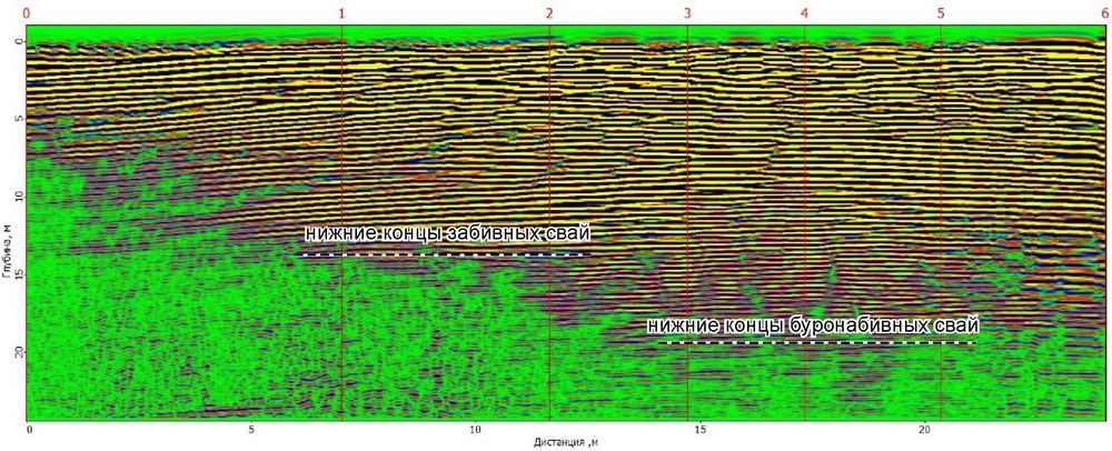 Определенные по результатам интерпретации материалов георадиолокации глубины заложения забивных свай составляют 9,5 м, а буронабивной сваи – 10,5 м.