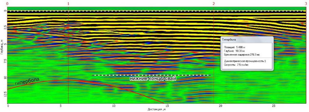 На практике в очень редких случаях на нижнем конце сваи образуется отражение гиперболической формы, характерное для локальных объектов, отличающихся от вмещающей среды по электромагнитным свойствам (рис. 3).