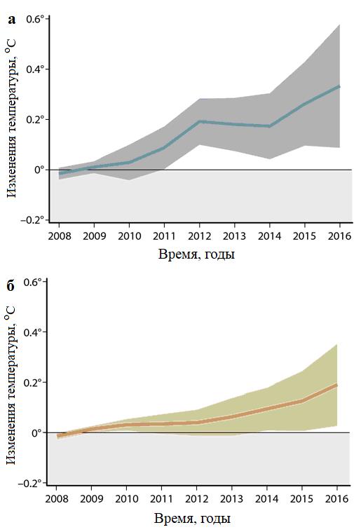 Рис. 4. Изменения среднегодовой температуры многолетнемерзлых пород на глубине около 9 м на десятках пунктов наблюдения по сравнению с базовой линией 2008–2009 гг. (температура увеличилась в 71 скважине, осталась неизменной в 40 скважинах и снизилась в 12 скважинах). Пункты наблюдений располагались: а – в Арктике; б – в высокогорьях [77]