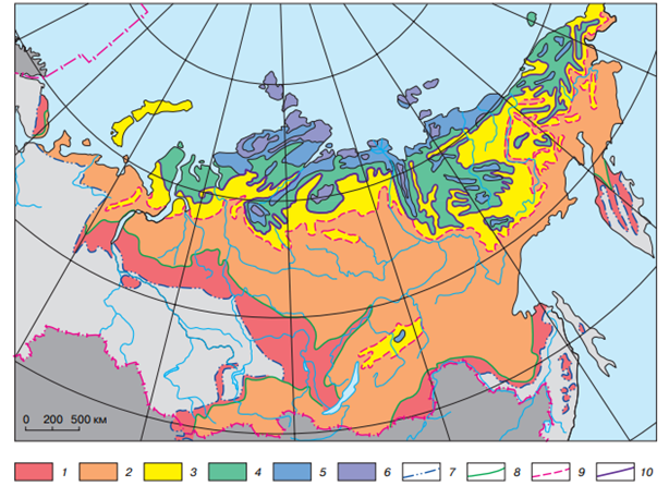 Рис. 9. Прогнозная карта [27], отражающая изменения криолитозоны России к концу XXI века при реализации наихудшего из возможных сценариев потепления климата. Разными цветами показаны зоны: 1 – полной деградации многолетней мерзлоты; 2 – мерзлоты несливающегося типа; 3 – мерзлоты островного типа; 4–6 – сплошной мерзлоты с понижающейся (в среднем к северу) температурой. Границы: 7 – современная южная граница распространения многолетней мерзлоты, 8–10 – границы между соответствующими зонами мерзлоты