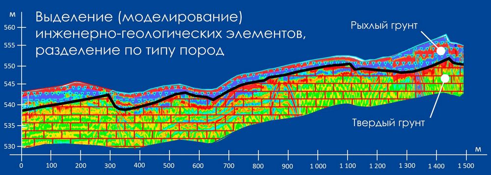 Нами было выполнено выделение (моделирование) инженерно-геологических элементов по трассе нефтепровода. Мы разделили грунты в подповерхностном пространстве по типу пород, определили границу между рыхлыми и твердыми грунтами.