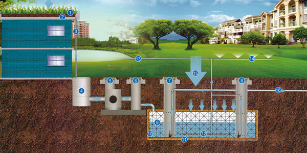 Рис. 11. Пример системы для сбора, очистки, хранения и использования дождевой воды [19]