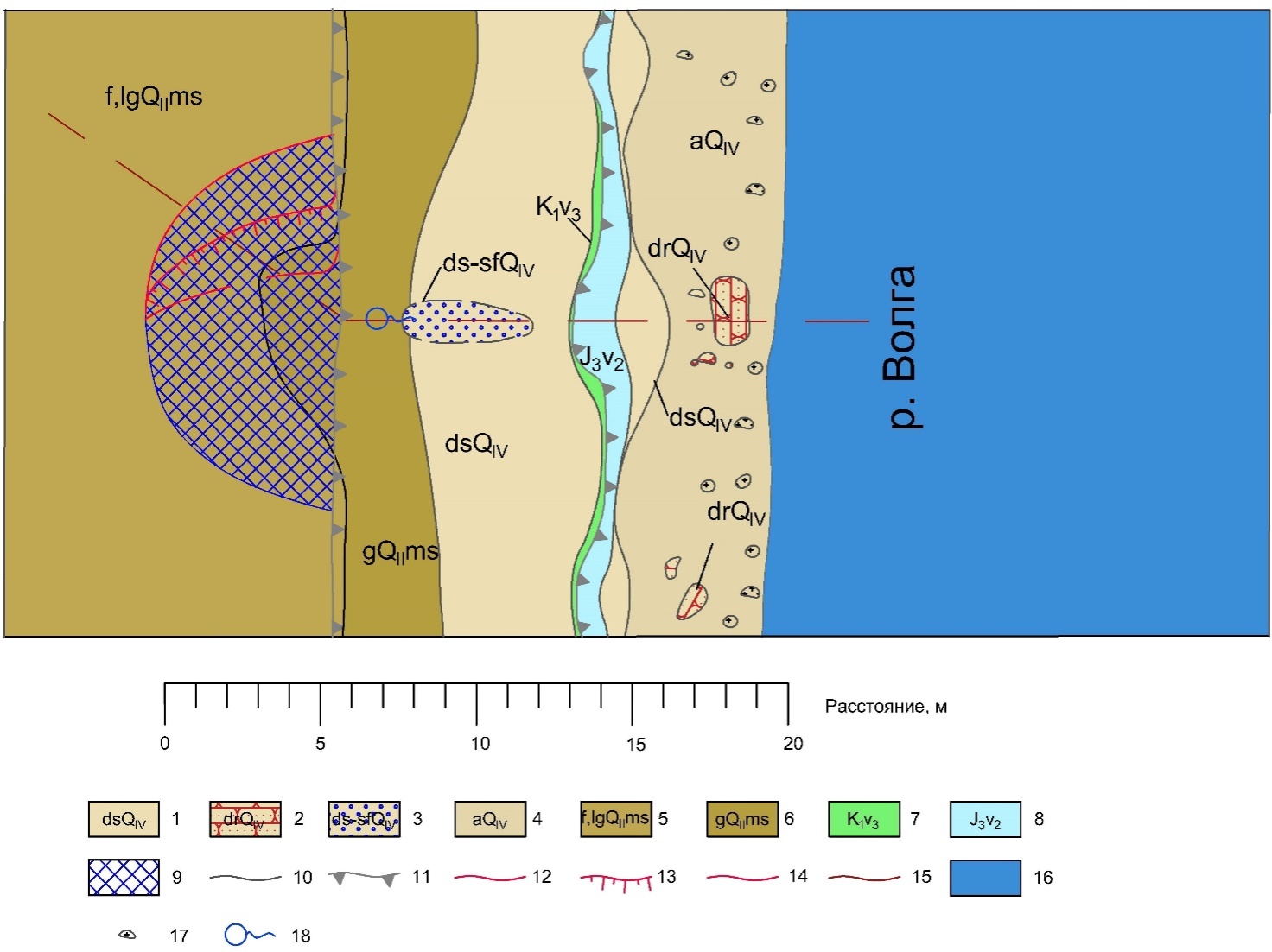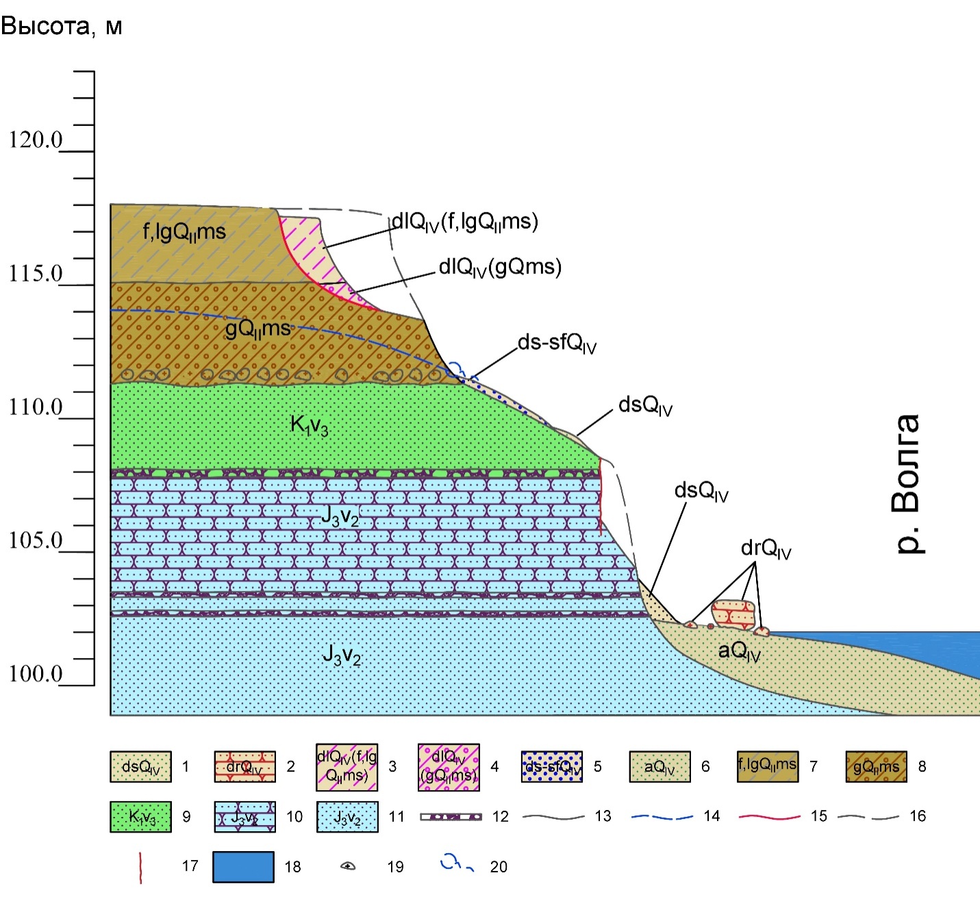 Условные обозначения: Голоценовые образования: 1 – осыпные; 2 – обвальные; 3-4 – оползневые образования по верхне- и средненеоплейстоценовым образованиям соответственно; 5 – суффозионно-осыпные; 6 – аллювиальные; Средненеоплейстоценовые образования: 7 – флювио-лимногляциальные образования московского горизонта; 8 – морена московского горизонта; Дочетвертичные образования: 9 – пески верхнего подъяруса валанжинского яруса нижнего мела; 10-11 – песчаники и пески среднего подъяруса волжского яруса верхней юры соответственно; Прочие обозначения: 12 – фосфоритовые горизонты; 13 – геологические границы; 14 – уровень подземных вод; 15 – зона скольжения оползня; 16 – профиль склона без развитых склоновых процессов; 17 – трещины отрыва; 18 – поверхностные воды; 19 – валуны; 20 – сезонные источники разгрузки подземных вод