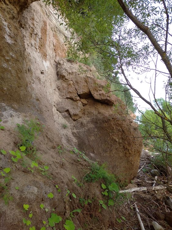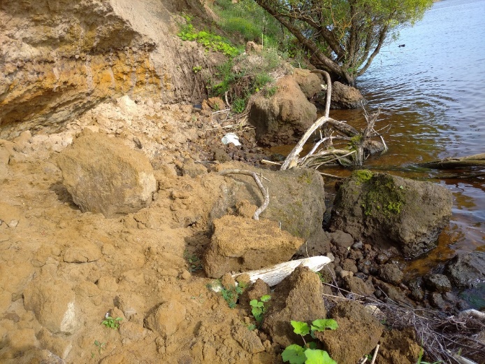 Отдельно следует выделить обвальные процессы, непосредственно связанные сэрозионным размывом берега, сопровождающиеся формированием эрозионных ниш в основании склона. Подобная форма приурочена к участку с неразвитой осыпью, где обнажаются пески, залегающие ниже фосфоритового конгломерата. Образование карнизов связано со значительно большей размываемостью песков нежели вышележащие песчаников. При достижении определённых размеров ниш в песках растягивающие напряжения превышают прочность песчаников на растяжение, это приводит к фронтальным обвалам, что сопровождается образованием карнизных форм. В ходе исследований была описана подобная форма размерами 9,5х2,3х1,8 м. Обвальные глыбы при этом имеют слабо вытянутую, почти изометричную форму, размерами 0,2-1,4 м в поперечнике (рис. 9, 10).