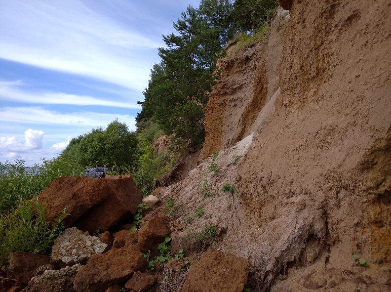 1) Обвально-оползневые процессы. Формирование обвально-оползневых тел начинается со смещения блока по поверхности скольжения, заканчивающееся свободным падением блока. На исследуемом участке обвально-оползневые тела представляют собой блоки, шириной до 3,3 м, длиной до 4,5 м, объемом до 16 м3. Как правило, в силу высоты и морфологии склона блоки оказываются прислонёнными к склону (рис. 6). Развиты на участках с почти отвесными стенками волжских песчаников, в частности, в местах, где высота нижней части склона над осыпью не превышает 4-5 м.