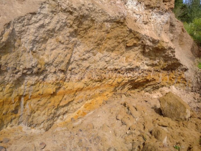 Средняя часть склона высотой порядка 3,5 м является более пологой с крутизной 30-32°. Эта часть склона слагается отложениями верхнего подъяруса валанжинского яруса нижнего мела (K1v3) (рис. 5). Меловые отложениями представлены: