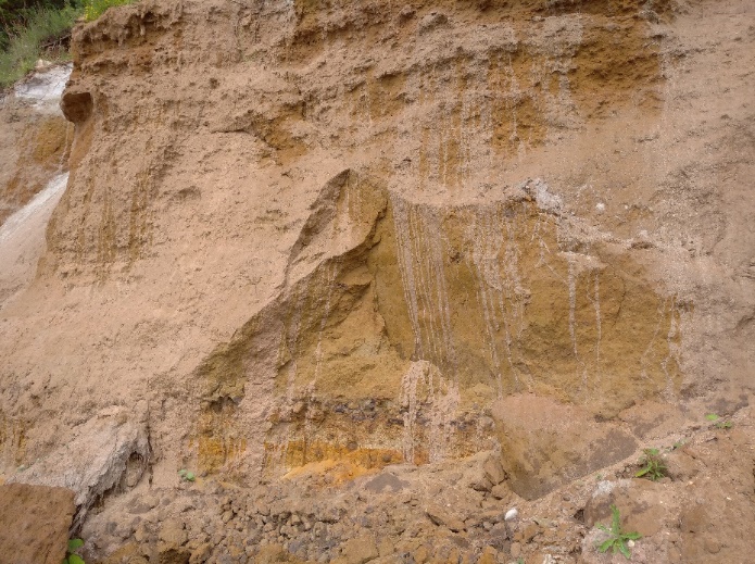 Разгружаясь, подземные воды выносят дисперсные частицы из супесей и суглинков, отлагая их в средней части склона. Вотдельных случаях ниже источника разгрузки подземных вод располагается слабовыпуклое удлинённое тело песчаного и супесчаного состава, с размерами 5х2 м. Предположительно, представляет собой продукты суффозионного выноса дисперсного материала. Несмотря на то, что для суффозионных оползней не характерно развитие в моренных отложениях — по данным Дж.Хатчинсонаподобный случай также были зафиксирован в Англии [8].