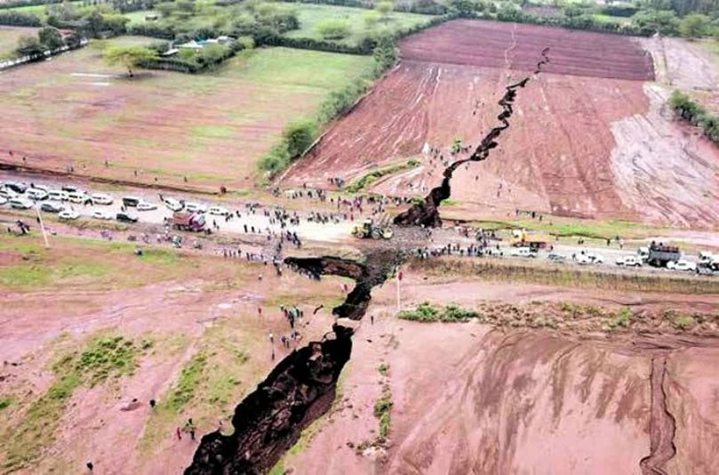 Рис. 5. Фрагмент Восточно-Африканской зоны «живых» разломов (Кения), протянувшихся от устья р. Замбези до залива Акаба в Красном море. В центре кадра разорванная трещиной дорожная трасса. Африканский континент раскалывается у нас на глазах, но как быстро это будет происходить, мы не знаем