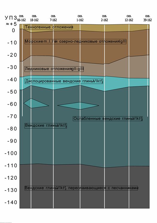 Вендские глины относятся к верхнепротерозойским отложениям вендской системы котлинского горизонта (Vkt2). Их возраст составляет 680—570 млн. лет, что относит их к одним из самых древних отложений планеты. Фактически, по числу пластичности их следует относить не к глинам, а к суглинкам, представленным в основном твердой консистенцией. Грунты имеют тонкослоистую структуру с включением прослоек сцементированного песчаника, что делает их довольно неоднородными по своим физическим и механическим свойствам.