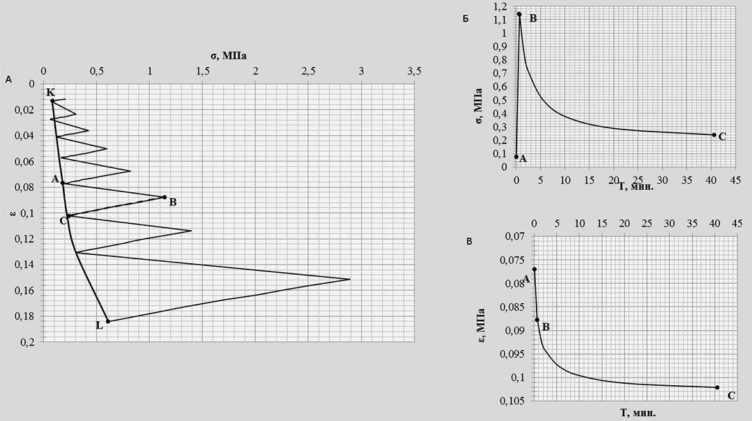 Данный процесс был промоделирован в приборах трехосного сжатия. После всестороннего обжатия бытовым давлением образец за промежуток времени, соответствующий времени его подъема на поверхность, разгружался до атмосферного давления. При этом фиксировалось изменение порового давления. Затем образец выдерживался в разгруженном состоянии еще продолжительный период времени, что моделировало процесс его хранения.