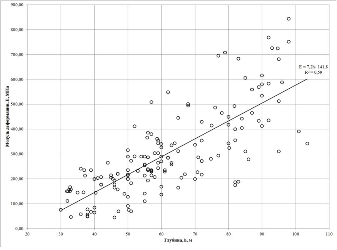 Объединение результатов полевых и лабораторных испытаний при определении нормативного значения модуля деформации позволило учесть весь объем данных, что повысило статистические параметры надежности результатов. Так, в сравнении с результатами прессиометрических испытаний, коэффициент детерминации увеличился с 0,51 до 0,59, а коэффициент корреляции, соответственно, с 0,71 до 0,77.