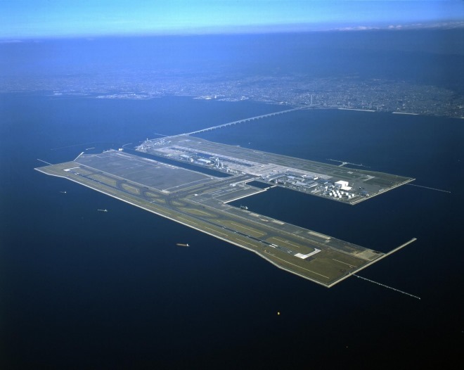 Рис. 1. Международный аэропорт Кансай, построенный в 1987–1994 годах на насыпном острове длиной 4 км и высотой 15 м над уровнем моря (30 м от дна) в Осакском заливе. Остров соединен 3-километровым двухэтажным мостом с городком Ринку – пригородом города Осака [2, 7]