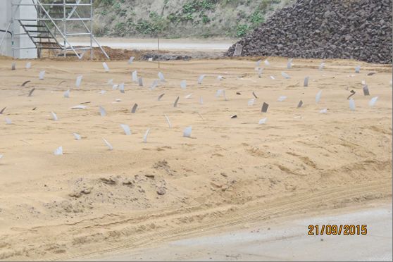 Отметим, что необходимое количество геосинтетических дрен определялось по специальным номограммам на основании коэффициента консолидации илов и заданной продолжительности консолидации. Глубина их погружения была обусловлена средней мощностью илов, составлявшей 10 м. На рисунке 5 показано поле геодрен, установленных с шагом 1 м х 1 м.