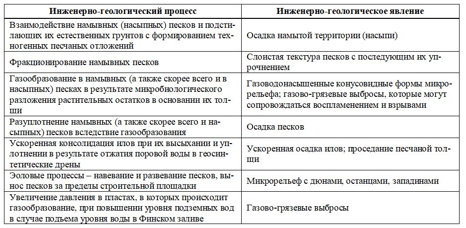 Обобщение информации по инженерно-геологическим процессам и явлениям при создании рассматриваемых намывных и насыпных участков в Санкт-Петербурге представлено в таблице. Эту таблицу можно рассматривать как сводку прогнозов, которые необходимо учитывать при проектировании и создании таких искусственных территорий.