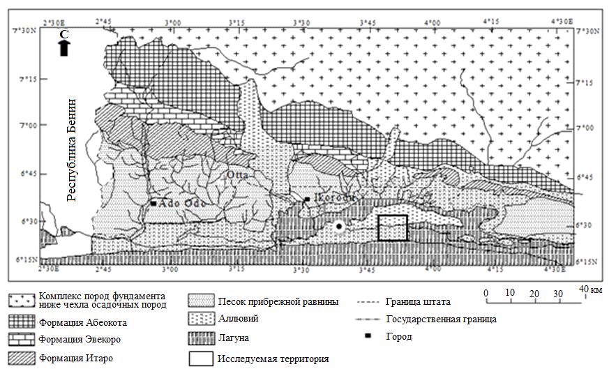 Исследуемая территория располагается в районе местного самоуправления Эти-Оса в юго-восточной части штата Лагос на юго-западе Нигерии – между 6° 30′ 37» и 6° 30′ 18» с.ш. и между 3° 36′ 3» и 3° 35′ 34» в.д. (рис. 1). Она находится недалеко от восточной окраины нигерийского сектора бассейна реки Бенин в зоне устьев рек и лагун с песчаными барьерными пляжами и сложена переслаивающимися глинами и песками, представляющими собой типичные морские отложения. Эти отложения переходят друг в друга и сильно варьируют как по простиранию, так и по мощности [11].