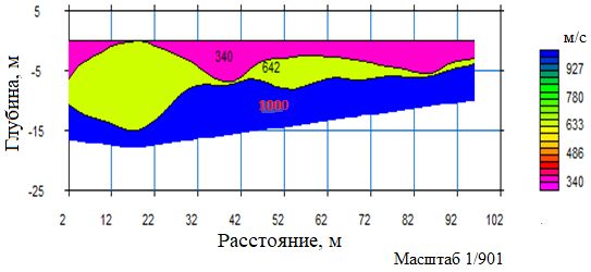 Интерпретация результатов исследований методом преломленных волн показала, что участок предполагаемого строительства до глубины около 18 м сложен тремя слоями. Верхний слой сложен неуплотненным геоматериалом, второй – выветрелым или полууплотненным, третий – уплотненным.
