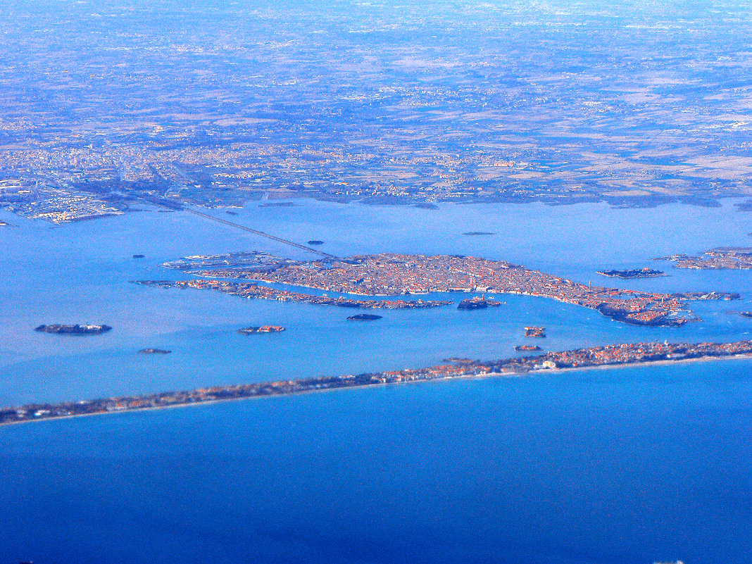 Рис. 3. Снимок Венеции с борта самолета. На переднем плане – Адриатическое море, далее – застроенная «барьерная» песчаная коса, отделяющая Венецианскую лагуну от Адриатического моря, за ней – Венецианская лагуна с Венецией в центре снимка, далее – материковая часть [3]