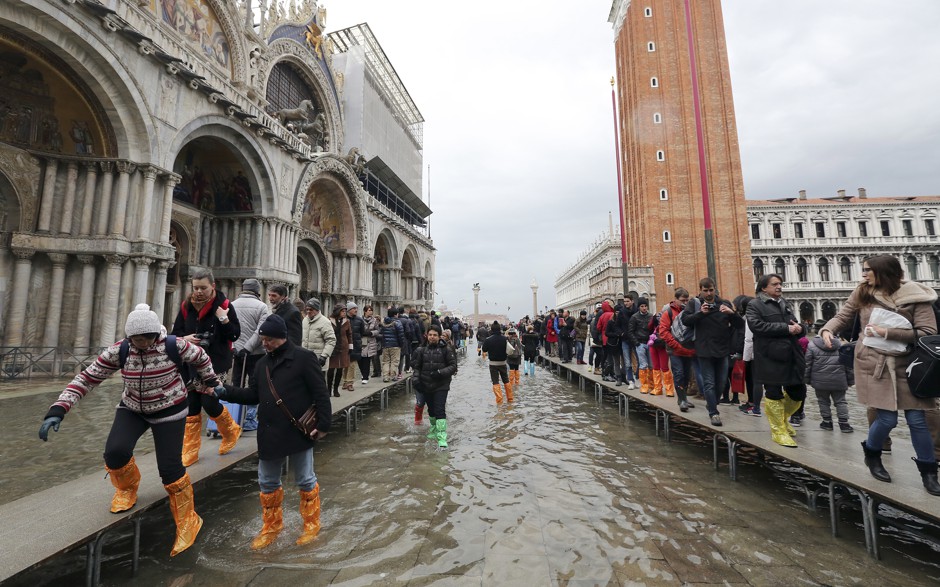 Рис. 10. Туристы идут по приподнятым мосткам на площади Святого Марка во время высокой воды [26]