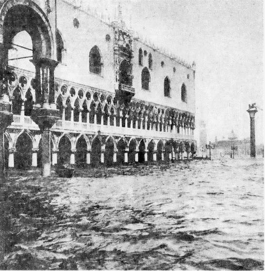 Самое катастрофическое наводнение произошло в Венеции 34 ноября 1966 года (рис. 11). В тот день это бедствие обрушилось на всю Северную Италию из-за встречи двух циклонов  с юга из центра Средиземноморья и с северо-востока. Скорость ветра составляла 80150 км/ч, на море бушевал девятибалльный шторм. Песчаная коса между Венецианской лагуной и морем и многие внутренние острова были покрыты водой на высоту до 4 м. Защитная стена «мурацци» прорвалась в десятках мест. В Венеции подъем воды составил 1,96 м выше среднего уровня моря (подобные события вероятны там один раз в 250 лет, если не учитывать продолжающееся увеличение интенсивности и частоты наводнений). Городу был нанесен чудовищный ущерб.