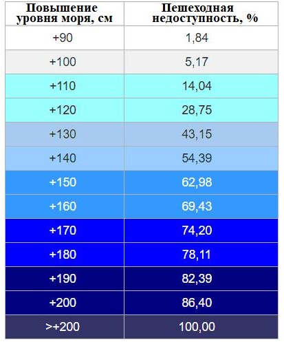 Рис. 12. Таблица пешеходной недоступности территории Венеции в зависимости от повышения уровня моря, составленная в 2009 году (по [12])