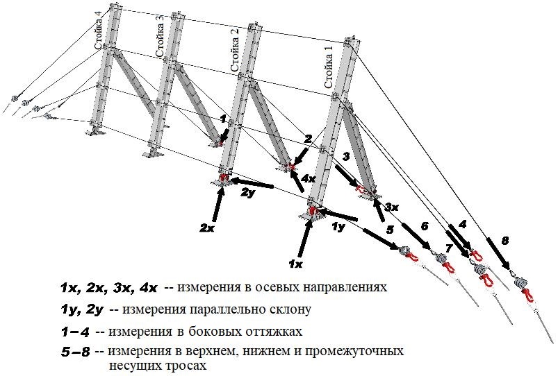 Рис. 2. Места расположения датчиков нагрузки и направления измеряемых усилий в конструкциях сетчатого противолавинного барьера Snowcatcher. Барьер изображен без сетки [4]