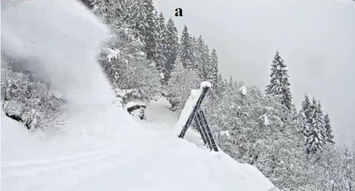 Сильный снегопад в зоне зарождения привел к сходу снежно-пылевой лавины, которая ударила в барьер Snowcatcher (рис. 4). Видеоролики, записанные более близко расположенной камерой, показали скорость фронта лавины 25–30 м/с перед тем, как облако снежной пыли ударило в барьер. Турбулентность и движение снега по бокам сооружения привели к плохой видимости, поэтому оценка скорости лавины после взаимодействия с барьером была невозможна. Тем не менее видеозапись с более далеко расположенной камеры показала отклоняющее и замедляющее воздействие барьера, хотя поверхность сетки и оставалась проницаемой для частиц снега. Объем лавинных отложений был оценен примерно в 1000 куб. м.