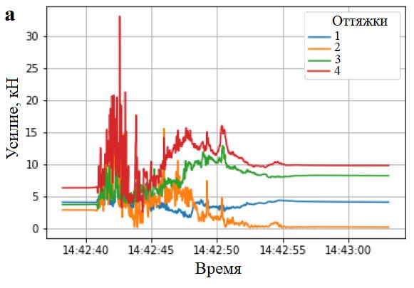 Рис. 5. Результаты измерения усилий в конструкциях барьера Snowcatcher при взаимодействии со снежно-пылевой лавиной, сошедшей 13 января 2019 года: а – силы натяжения в боковых оттяжках; б – силы сжатия в основаниях подкосов лямбда-образных опорных конструкций [4]