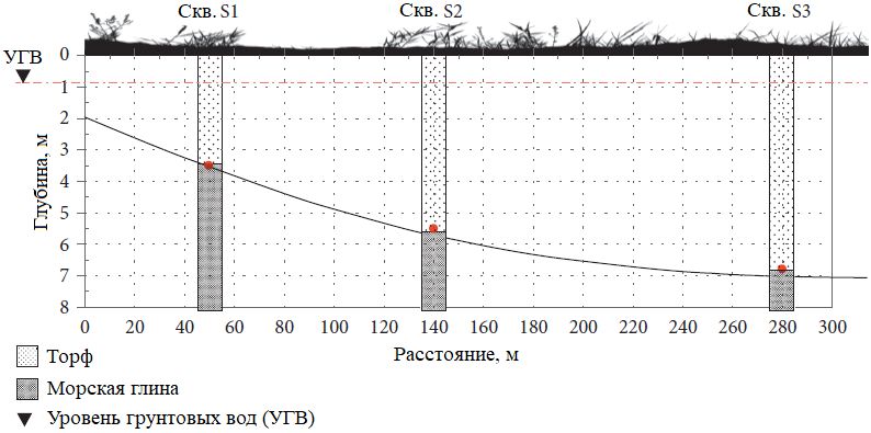По результатам бурения был аппроксимирован приблизительный стратиграфический разрез изучаемой территории, показанный на рисунке 5. Видно, что мощность слоя торфа в данной области варьирует. Это позволяет предположить, что массив этого грунта представляет собой торфяной бассейн.