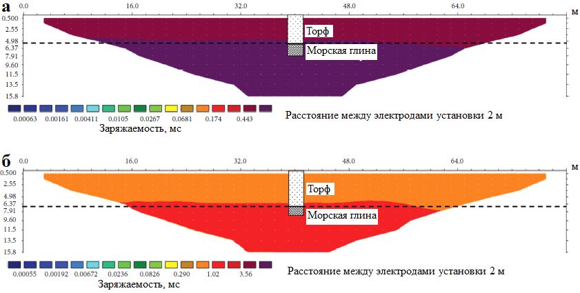 Результаты инверсии данных ВП, показанные на рисунке 7, определяют торф как менее заряжаемый (менее поляризуемый) по сравнению с залегающей ниже морской глиной. Этому может способствовать менее заряжаемый органический материал в торфяном грунте. (Как обсуждалось в предыдущем исследовании [8], реакция ВП в торфе обусловлена увеличением поляризации, а не результатом изменения объемной проводимости; и поляризация предположительно происходит вследствие поверхностной плотности электрического заряда органического материала. Однако величина заряжаемости (или поляризации), по-видимому, является хорошим показателем толщины торфяного грунта.) Высокие значения заряжаемости слоя морской глины по сравнению с торфяным обеспечивают четкое разделение между этими двумя слоями, что позволяет с большой точностью определлять стратиграфию торфяного грунта.
