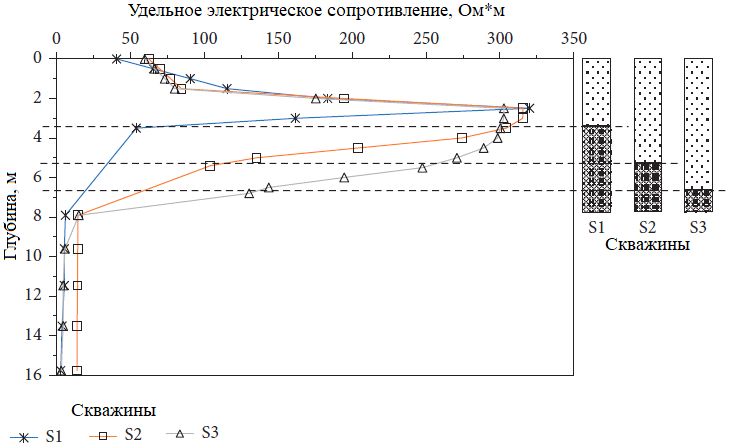 Рис. 8. Изменения удельного сопротивления грунта с глубиной на полуострове Клиас