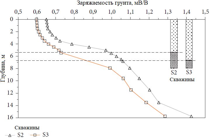Значения заряжаемости, извлеченные из изображений, полученных методом ВП, показаны на рисунке 9. Они немного увеличиваются с глубиной в слое торфяного грунта, в то время как вблизи переходной зоны и в слое морской глины они растут с глубиной значительно. Полученные результаты показывают, что торфяной грунт был менее заряжаемым (менее поляризуемым) по сравнению с морской глиной. Значения заряжаемости торфа варьировали от 0,598 до 0,729 и от 0,651 до 1,060 мВ/В для скважин S2 и S3 соответственно.