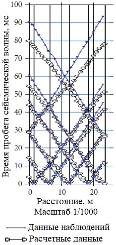 Рис. 10. Пример расчетных и наблюденных времен пробега сейсмических волн