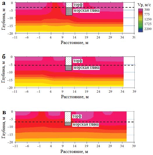 Полученные разрезы скоростей P-волн (Vp) показаны на рисунке 11. В целом наблюдалось нечеткое разделение между слоями торфа и подстилающей его морской глины. Контраст между наблюденными значениями Vp для них был небольшим, что затрудняло определение подошвы торфяного грунта и, таким образом, не позволяло определить его мощность. Небольшое увеличение жесткости торфа с глубиной было обусловлено низкой объемной плотностью и высоким уровнем грунтовых вод [41].