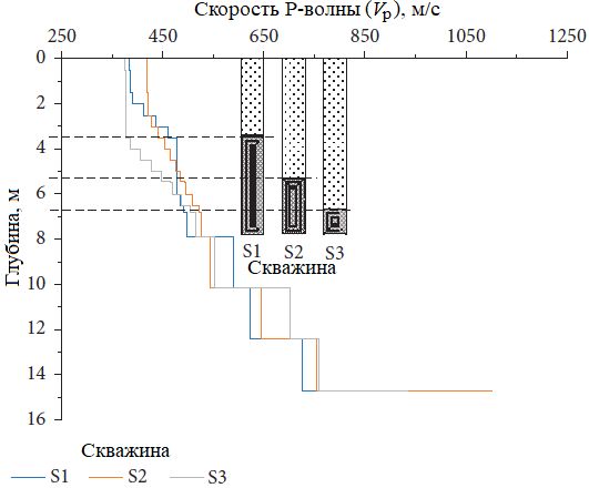 Рис. 11. Разрезы скоростей P-волн (Vp) для скважин S1 (a), S2 (б) и S3 (в)