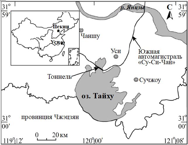 Место испытаний находилось в пределах мелководного озера Тайху недалеко от китайского города Уси (Сишань) (рис. 1), где проходит Южная автомагистраль «Су-Си-Чан». Пересекающий северную часть озера отрезок шоссе (показанный жирной черной линией на рисунке 1) построен в виде тоннеля с использованием открытого способа проходки. На сегодняшний день это самый протяженный тоннель в Китае, построенный под озером. Длина его подводной части составляет 10,67 км. Из-за изменчивости механических свойств озерных глинистых отложений владельцам проекта и проектировщикам были необходимы более подробные параметры для анализа безопасности строительства. Поэтому Уханьским институтом механики скальных и дисперсных грунтов Китайской академии наук вдоль трассы строительства этого тоннеля на дне озера Тайху были проведены испытания самозабуривающимся прессиометром.