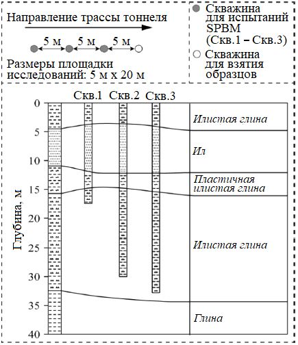 Испытания проводились в скважинах с использованием самозабуривающегося прессиометра кембриджского типа, с помощью которого можно оценивать такие свойства грунта, как модуль сдвига, недренированная сдвиговая прочность, горизонтальное напряжение и др. Вдоль указанной части трассы тоннеля были проведены три серии испытаний SBPM при горизонтальном расстоянии между скважинами 5 м. Средняя глубина этих скважин составляла около 25 м, а высотные отметки их устьев были одинаковыми. Также была пробурена скважина, из которой отбирались образцы грунта для лабораторных испытаний в целях получения предварительной информации (рис. 2).