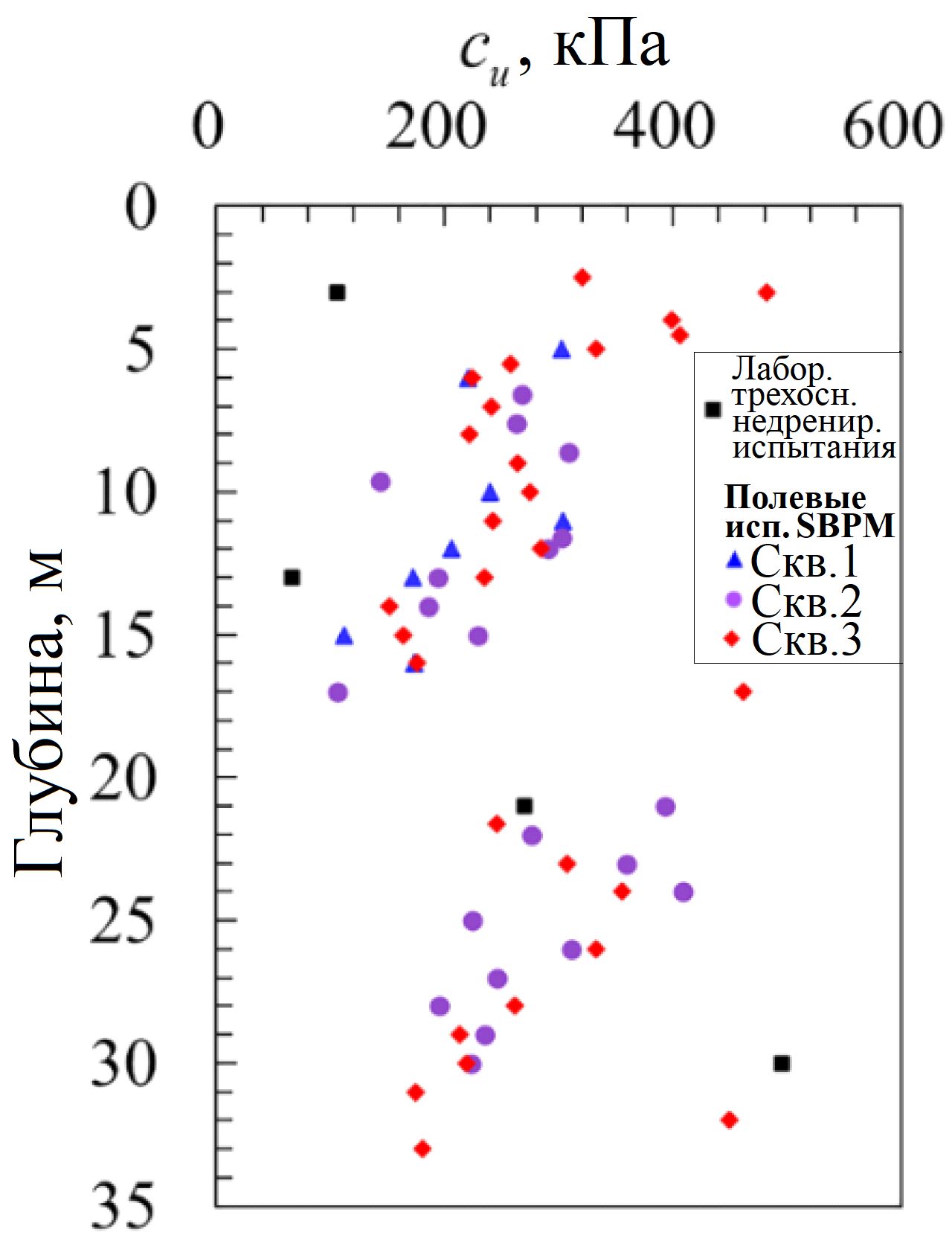 Рис. 6. Результаты определения недренированной прочности на сдвиг с помощью лабораторных трехосных испытаний и полевых испытаний самозабуривающимся прессиометром в скважинах 1, 2 и 3